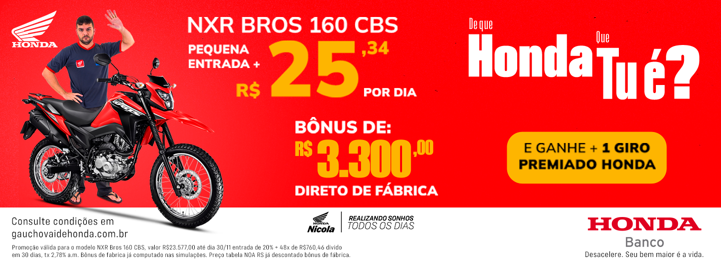 As revisões periódicas são um direito seu e devem ser realizadas conforme as condições descritas no Manual do Proprietário. E mais: quando você compra uma motocicleta Honda, a mão de obra das duas primeiras revisões é gratuita. Essas revisões são fundamentais para manter a sua motocicleta nas condições ideais de uso. Para agendar sua revisão, entre em contato com a nossa Central de Atendimento.